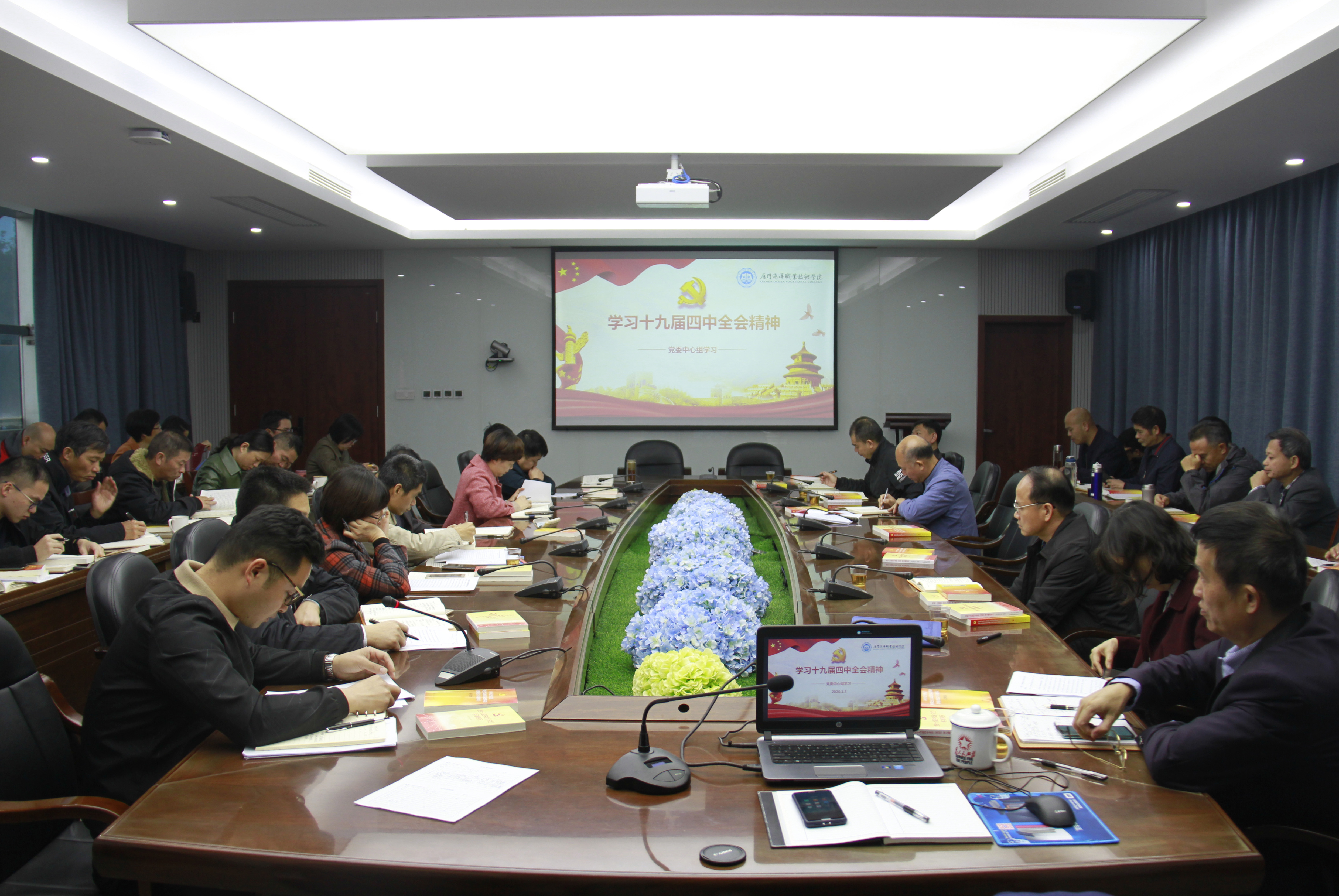 2020年1月16日,学院召开党委中心组学习(扩大)会,学习传达党的十九届四中全会精神,并研讨贯彻全国、全省教育大会精神实施方案。学院党政班子成员汤忠民、缪雄平、余云翼、马国玄、孙学耕与全体中层干部一起参加学习。