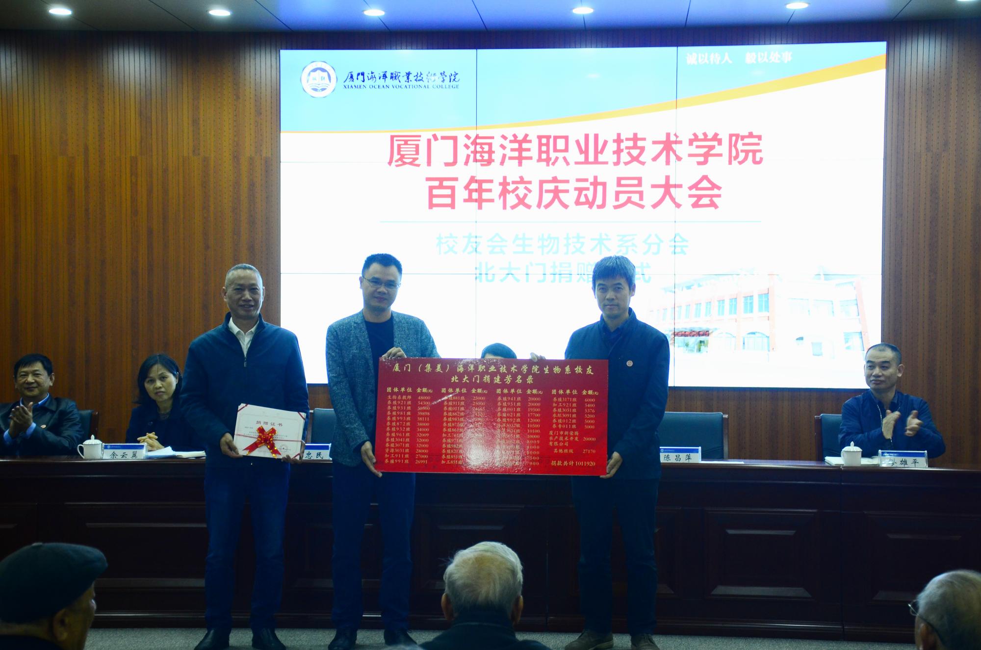 汤忠民解读了《厦门(集美)海洋职业技术学院校友会校友捐赠管理办法》和捐赠的途径。大会现场举行捐赠仪式,陈昌萍代表学校接受了校友会生物技术系分会向学校的捐款1011920元,用于学校北大门建设。学院党政领导、部分教职工、退休老同志纷纷现场为校庆捐款。