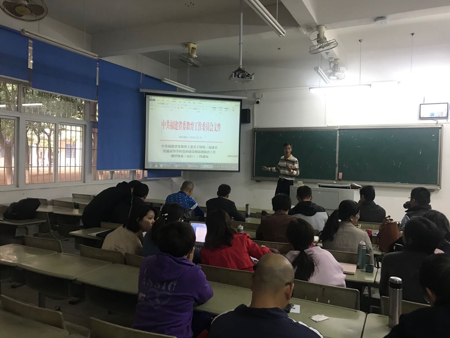 12月3日下午,基础部党总支召开全体教师大会,传达学习《国家职业教育改革实施方案》和《福建省普通高等学校党的建设和思想政治工作测评体系(试行)》通知精神,研究贯彻部署意见,党总支书记、基础部主任叶小超主持会议并讲话,基础部、思政部全体教师出席会议。