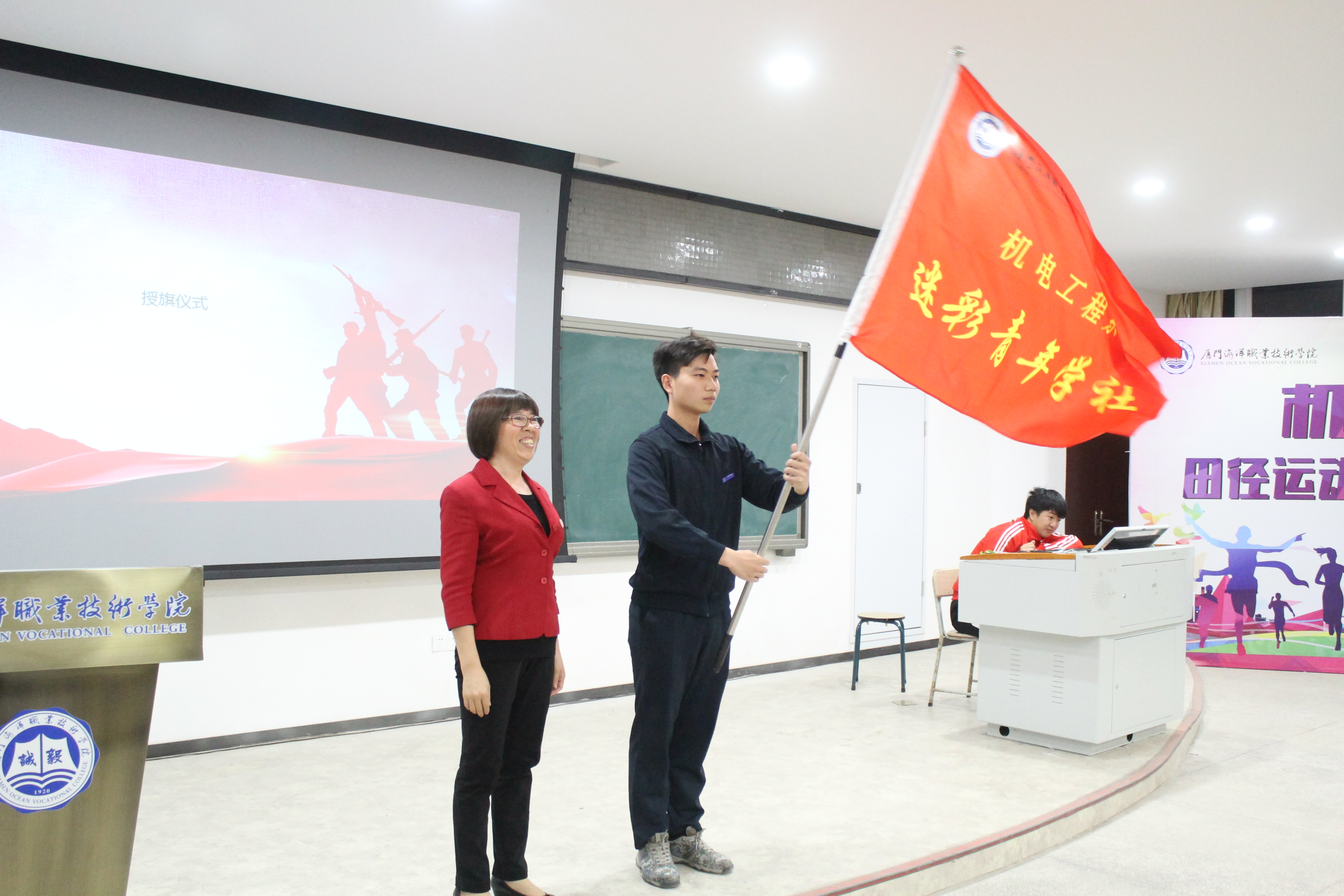 为增强大学生国防意识,做好学生国防知识教育、征兵动员、军事训练等工作,11月28日晚,机电系在翔教梯1隆重举行以退伍学生为骨干的迷彩青年先锋队成立暨授旗仪式。系党总支书记林玉媛、主任王忠杰、团总支书记黄瑞武、全体辅导员、学生代表及全体迷彩先锋队员参加。