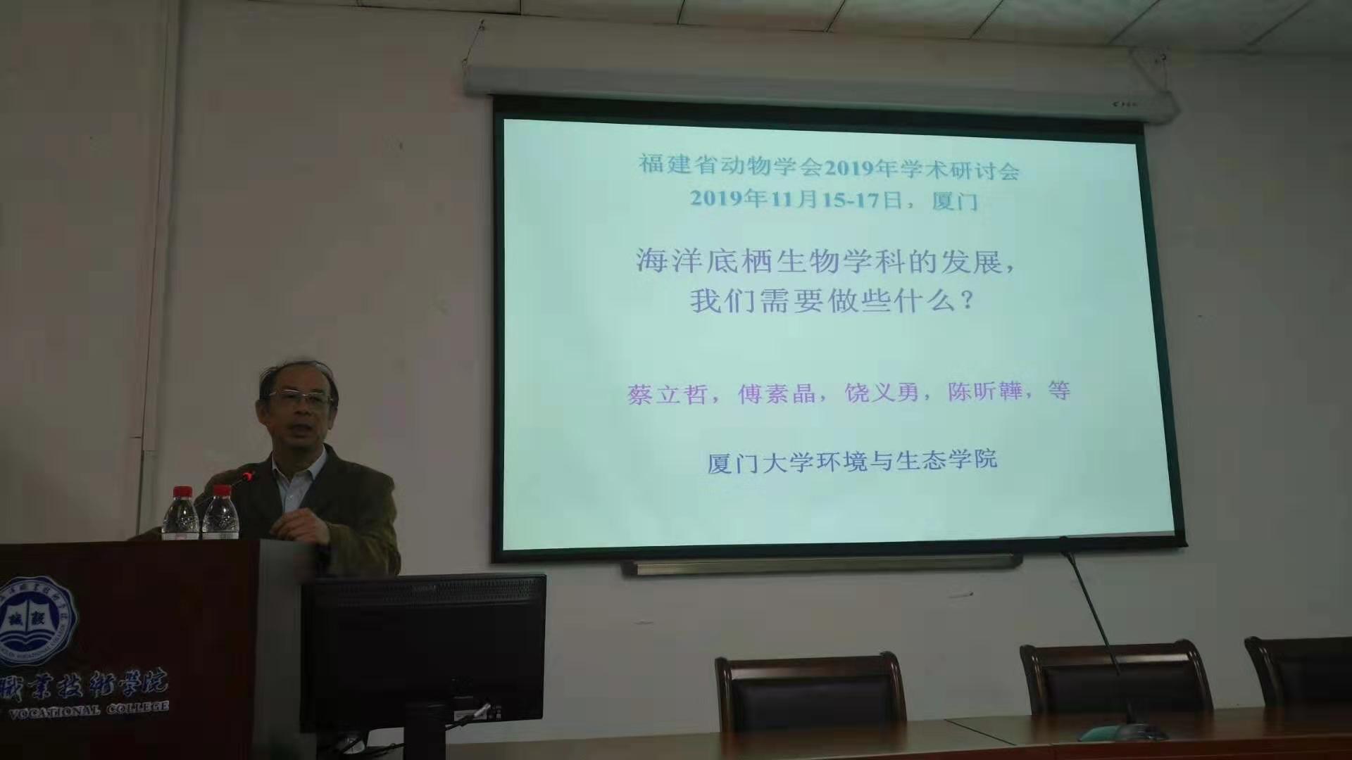 由福建省动物学会主办、厦门海洋职业技术学院承办的福建省动物学会2019年学术研讨会于2019年11月15-17日在学院思明校区隆重召开。来自厦门大学、福州大学、福建师范大学等10余所高校的80余名教授、专家、学者参加会议。研讨会由省动物学会秘书长张秋金教授主持,学会理事长耿宝荣教授、学院继教院刘秋林老师参加开幕式。