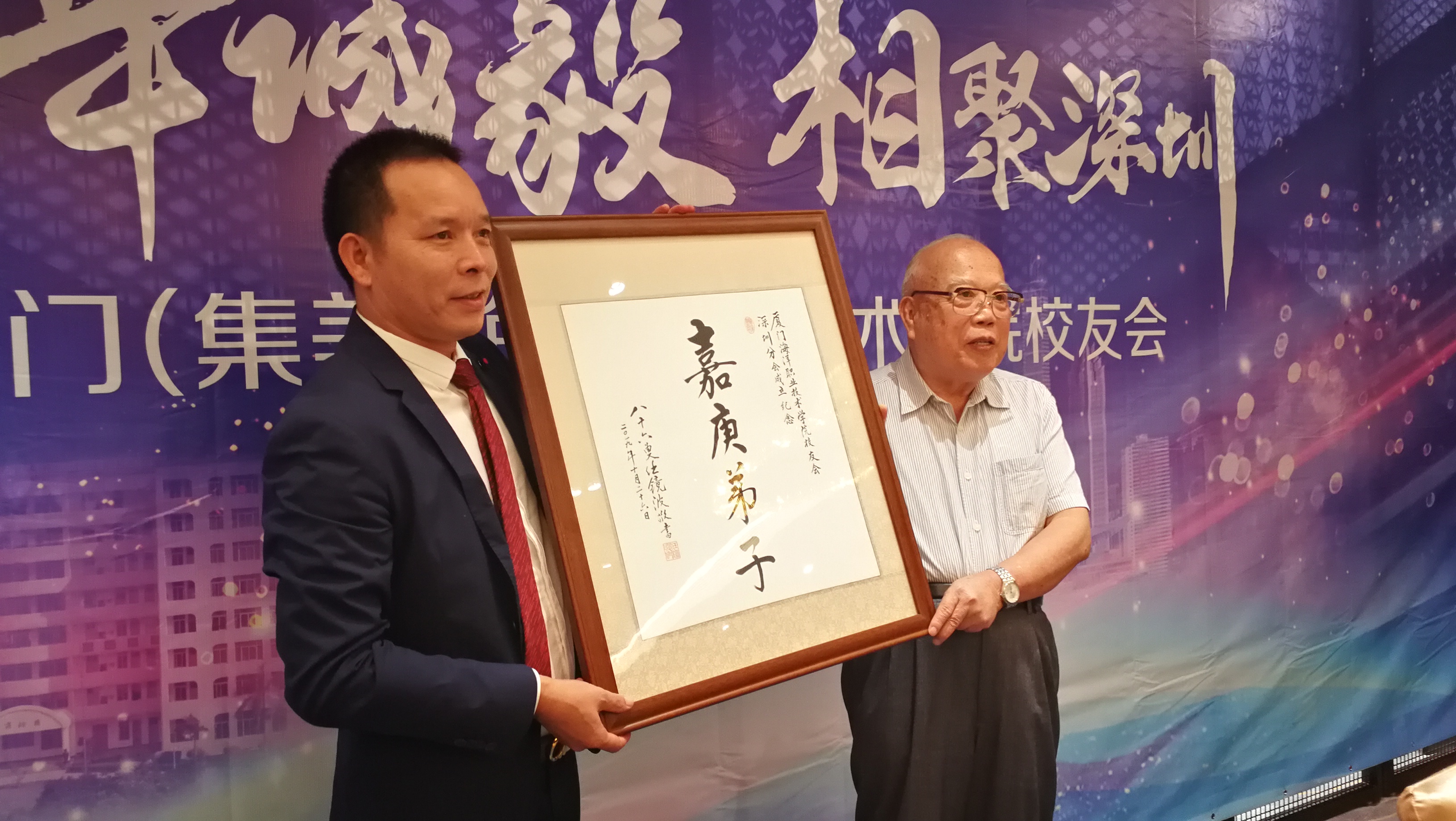 任镜波以“集美校友是一家”总结概括了集美校友总会、2020百年校庆的历史意义并向分会赠送“嘉庚弟子”墨宝。