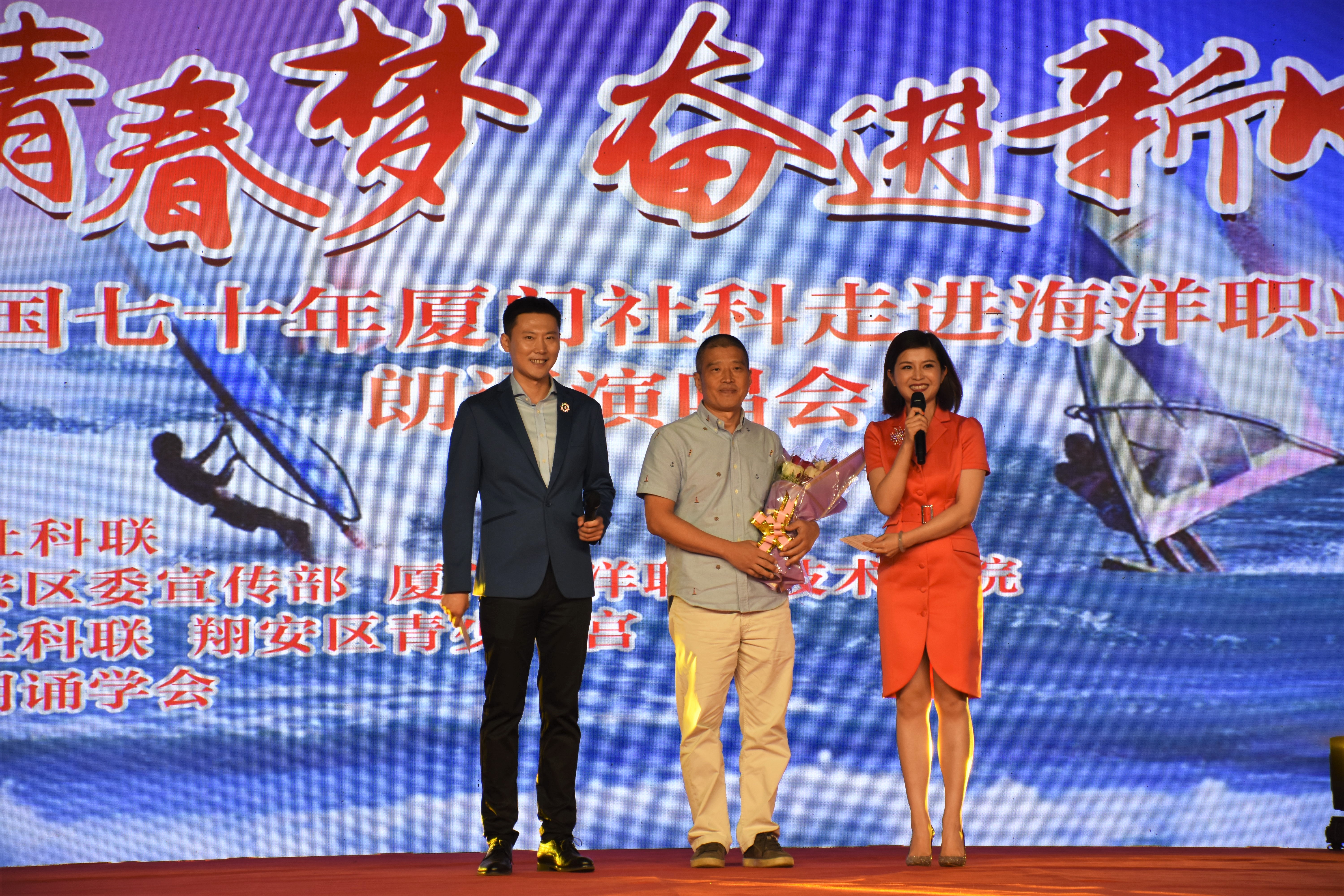 晚会依托“礼赞新中国奋进新时代”厦门市第十五届社会科学普及宣传活动周,以“激扬青春梦奋进新时代”为主题,用师生喜闻乐见的艺术表现形式,述说着心向党,心爱国的“初心”与“使命”。厦门朗诵协会为师生带来集体朗诵《红色箴言》、舞蹈《映山红》、故事朗诵《等待——致敬两弹元勋邓稼先》、歌曲《不忘初心》等红色经典节目,鼓励青年学生要听党话、跟党走,要不忘初心、牢记使命,树立远大理想,主动担当作为。《厦门海堤精神赞》《向厦门号敬礼》《远航》《我爱这蓝色的海洋》等海洋特色主题节目充分展现了以海为伴的厦门人民对海洋的依恋和向往,以及为建设美好家乡,探索深蓝世界,宣传海洋文化做出的积极贡献。大学生艺术团跳起优美的舞蹈《闽海情》唤起现场师生的思乡情意。此次活动还有幸邀请到厦门号勇士之一刘祖扬莅临晚会现场,他深情地告诉师生要热爱海洋、保护海洋。今年恰逢海院建校99周年,10月21日是校主陈嘉庚先生诞辰145周年纪念日,诗朗诵《嘉庚颂》表达了学院师生对校主陈嘉庚先生的深切缅怀,激发青年学生以更加积极向上的姿态迎接学院2020百年华诞。