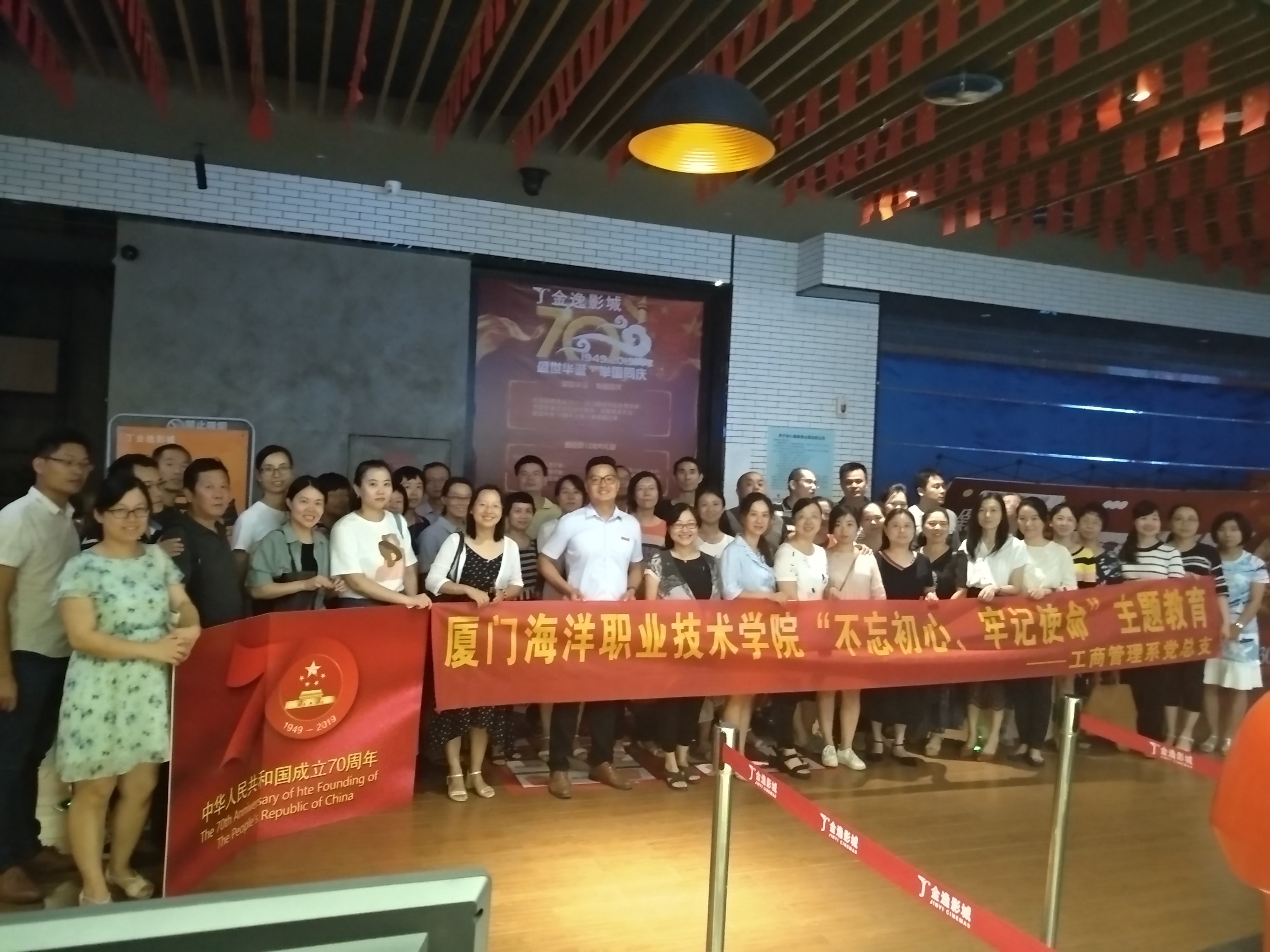 为贯彻落实《中共中央关于在全党开展“不忘初心、牢记使命”主题教育的意见》等重要文件精神,10月8日,工商系党总支开展“不忘初心,牢记使命”主题教育主题党日活动,于翔安区金逸影城集中观看爱国主义题材电影《我和我的祖国》,工商系党总支副书记张宇泉以及全体老师到场参加。