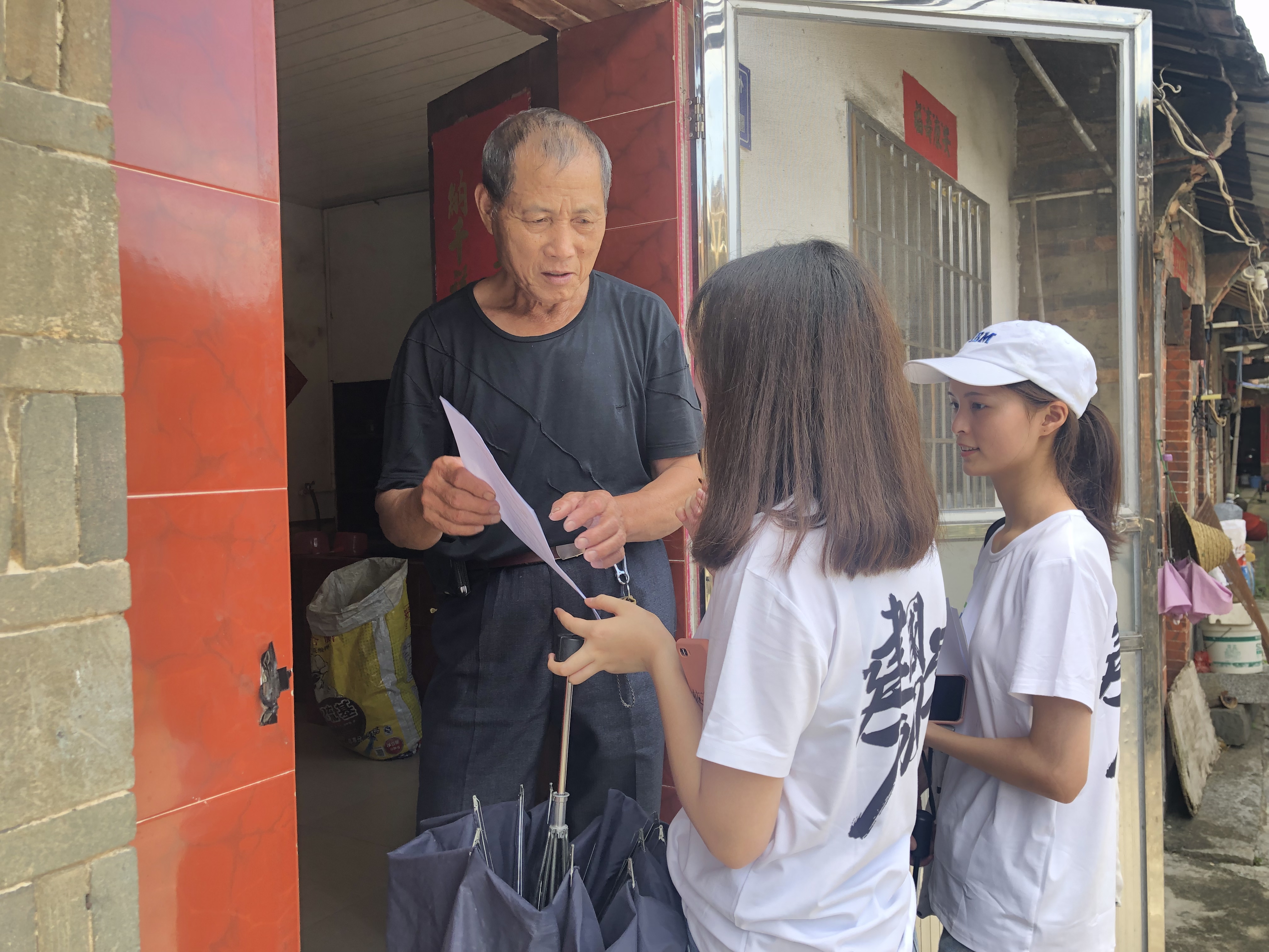 7日上午,队员们走访福建第一古堡——蔡家堡,参观坐落于古堡中心的社会主义农村发展史展览馆,了解新中国成立70年来农村的发展变化和农民的富裕安康,并分组入户开展问卷调查,调研村民对建国70周年的认知和农村发展变化的看法。