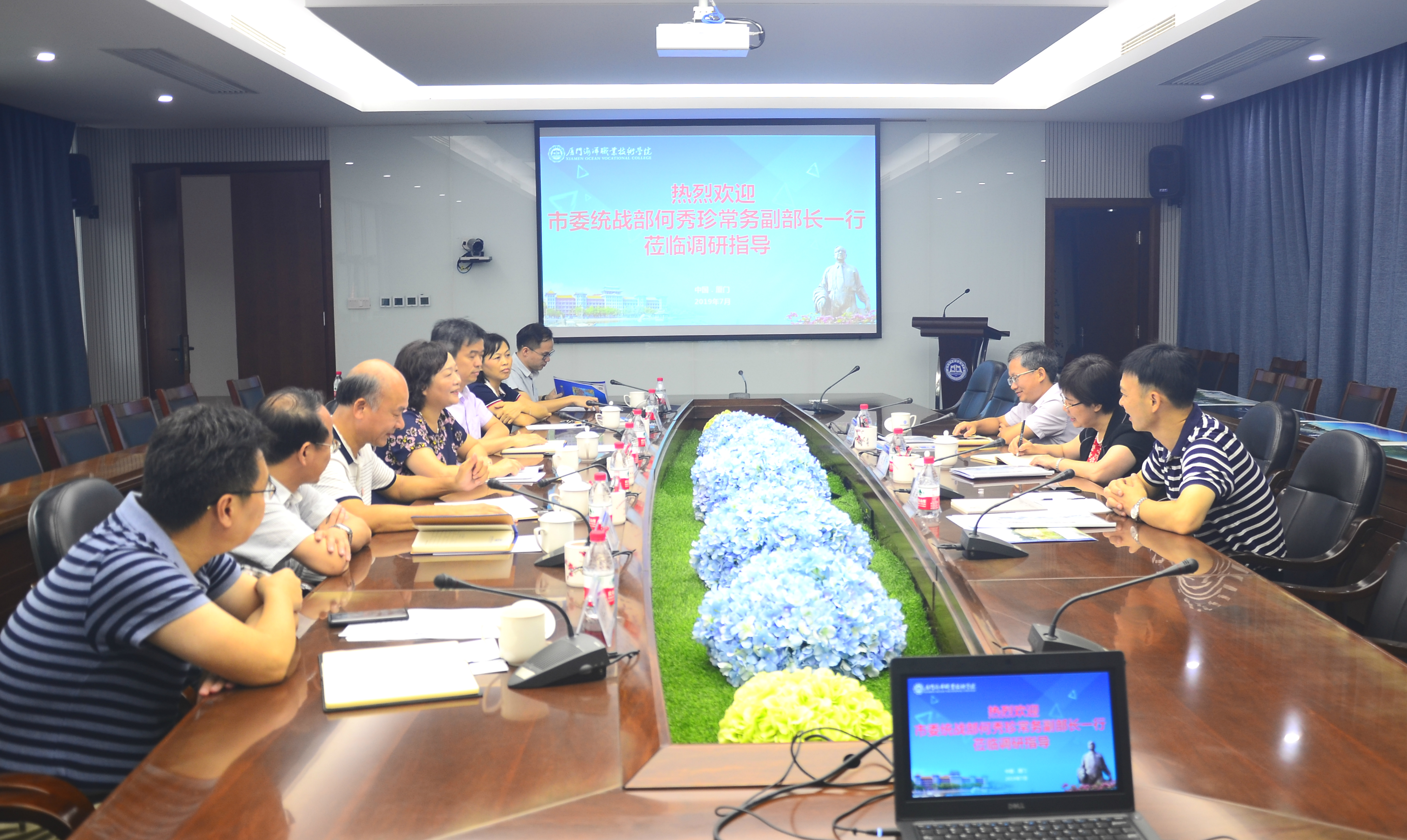 7月11日,厦门市委统战部常务副部长何秀珍一行到我院调研,厦门市委统战部办公室主任翁荣标、集美学校委员会主任助理、办公室主任张志方同行,学院领导陈苏丽、陈昌萍、汤忠民、余云翼、马国玄陪同调研。