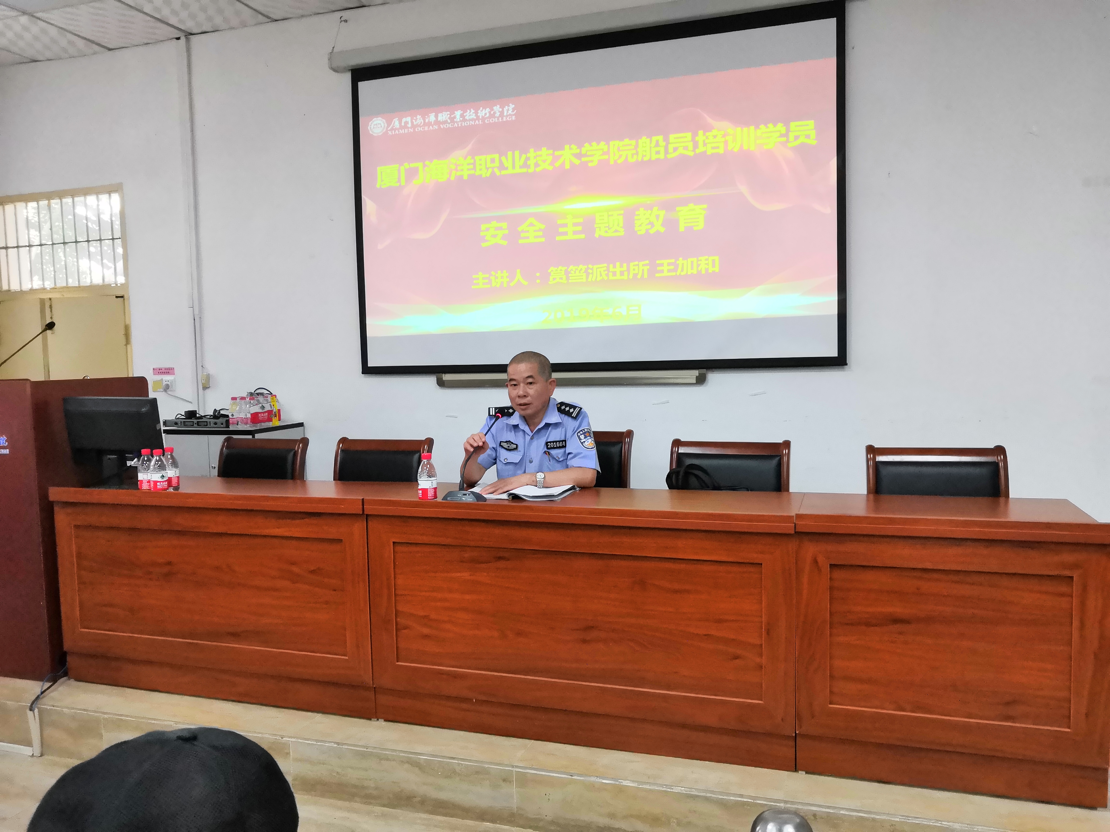 为切实增强船员培训学员的安全意识,提高安全防范技能,6月21日下午,成教部特邀厦门市思明区公安局筼筜派出所王加和警官在思明校区报告厅开展安全主题教育讲座,近200名社会船员培训学员参加。