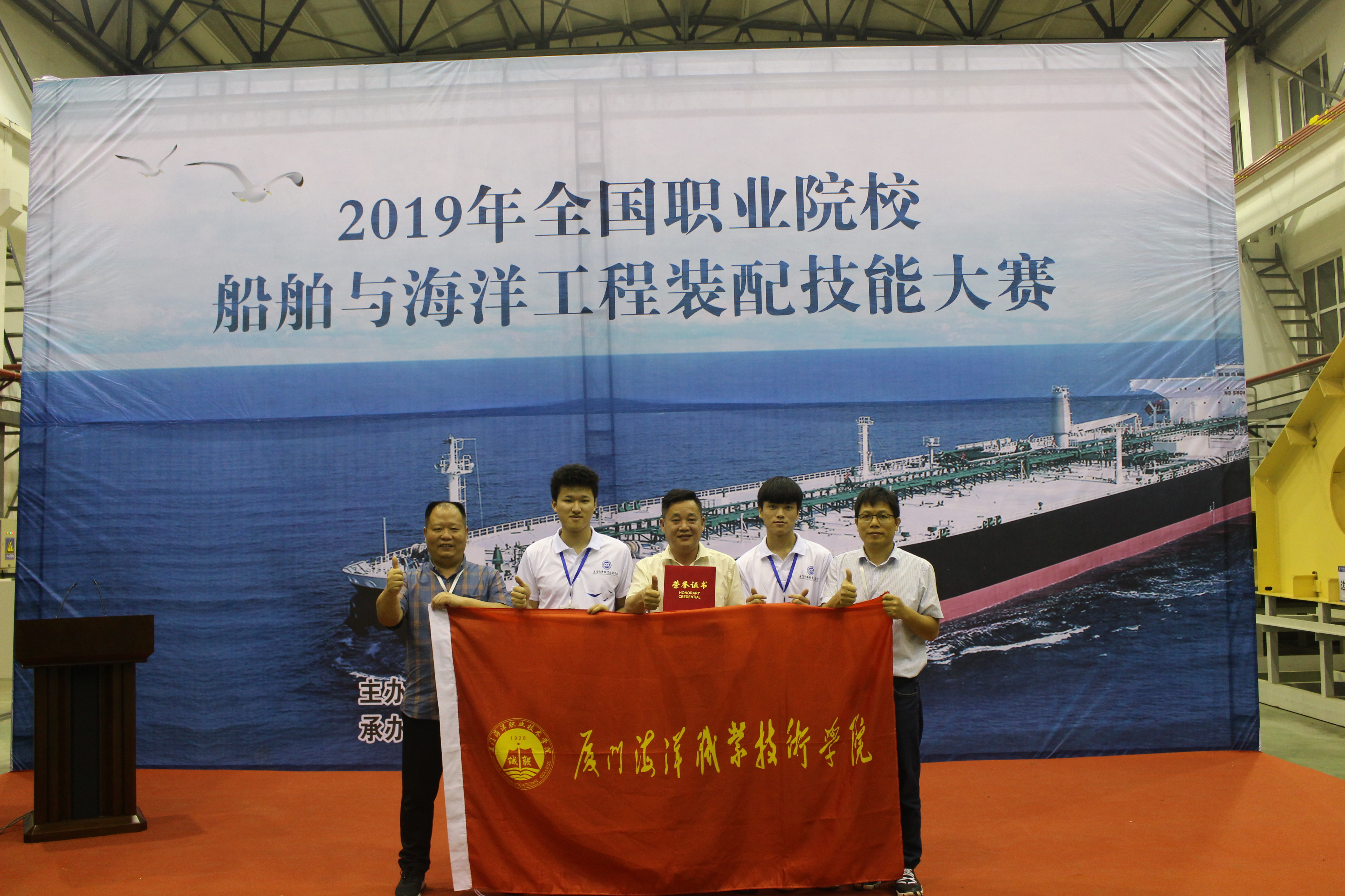 5月24-26日,2019年全国职业院校船舶与海洋工程装配技能大赛在辽宁省葫芦岛市举行。由学院航海技术系教师林文城、张金聪、张晨东指导,船舶检验专业张泽华、詹术杭组成的参赛队荣获“团体一等奖”,学院获得优秀组织奖。