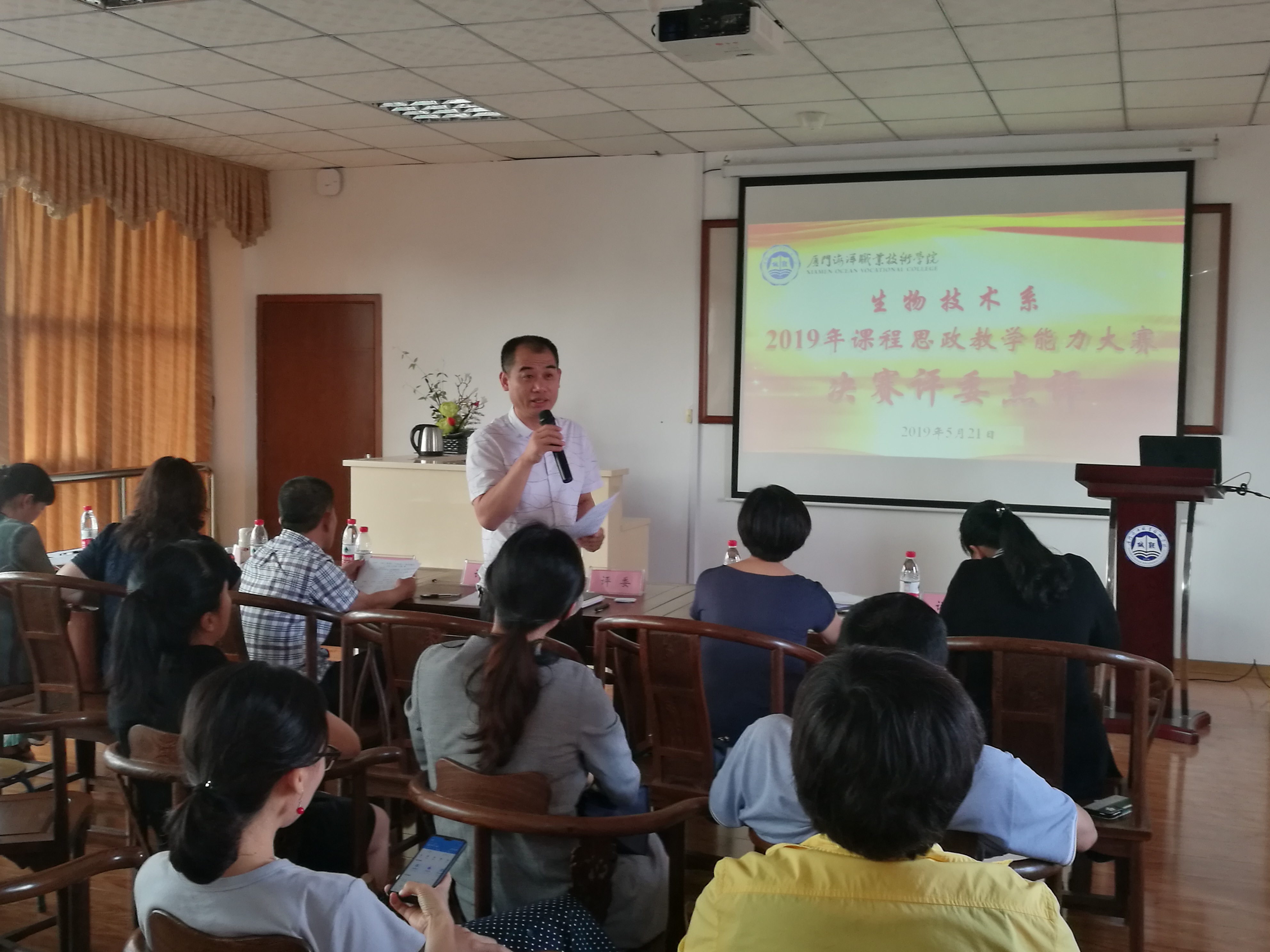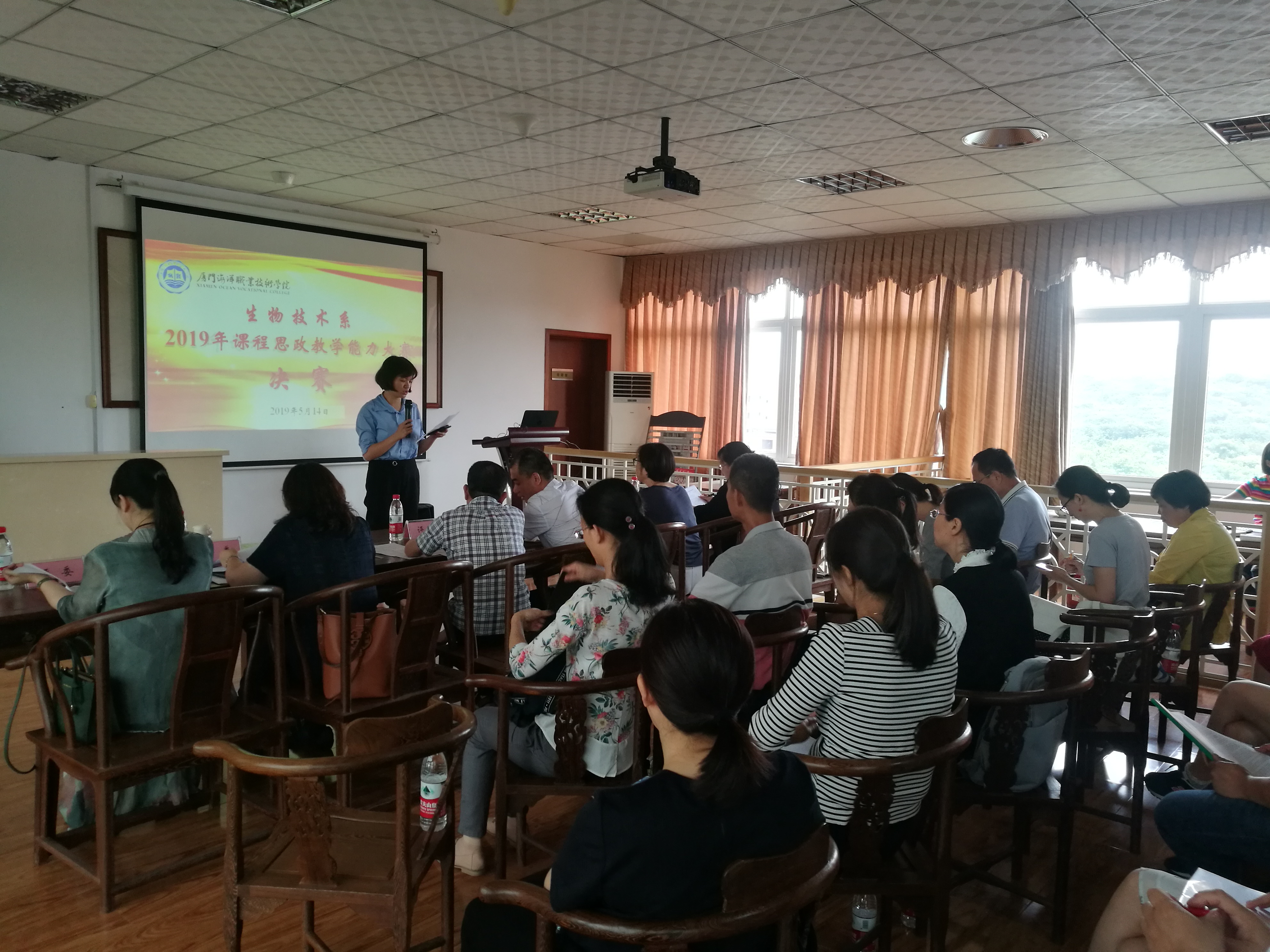 5月21日下午,生物技术系2019年“课程思政”教学能力竞赛决赛在翔安校区办公楼501举办。学院党委副书记、工会主席汤忠民出席活动,党委委员、纪委书记缪雄平,督导团团长祝敏、人事处教师发展中心副主任杨静怡、思政部副教授何金龙、思政部二级督导朱静蓓、思政部教师刘慧文担任竞赛评委。