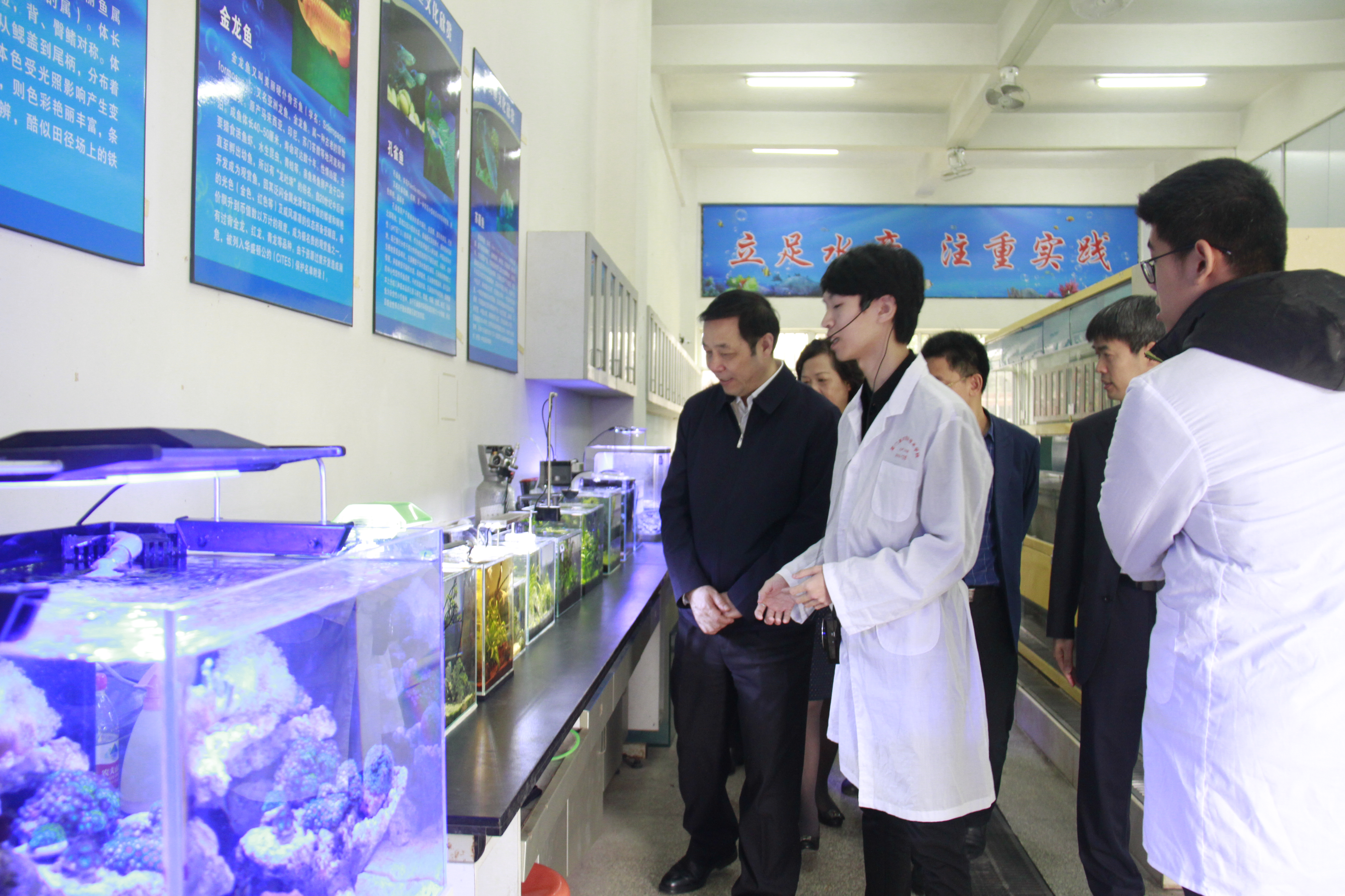 ▲杨贤金副省长调研学院观赏鱼实训基地(水产养殖专业学生创新创业基地)
