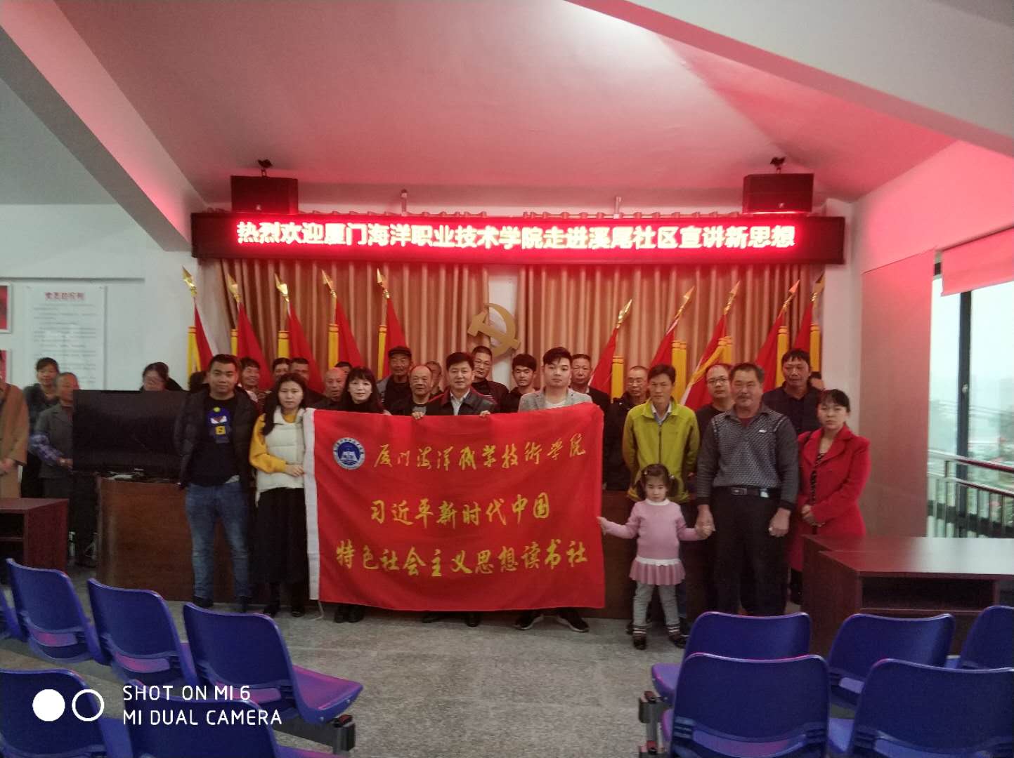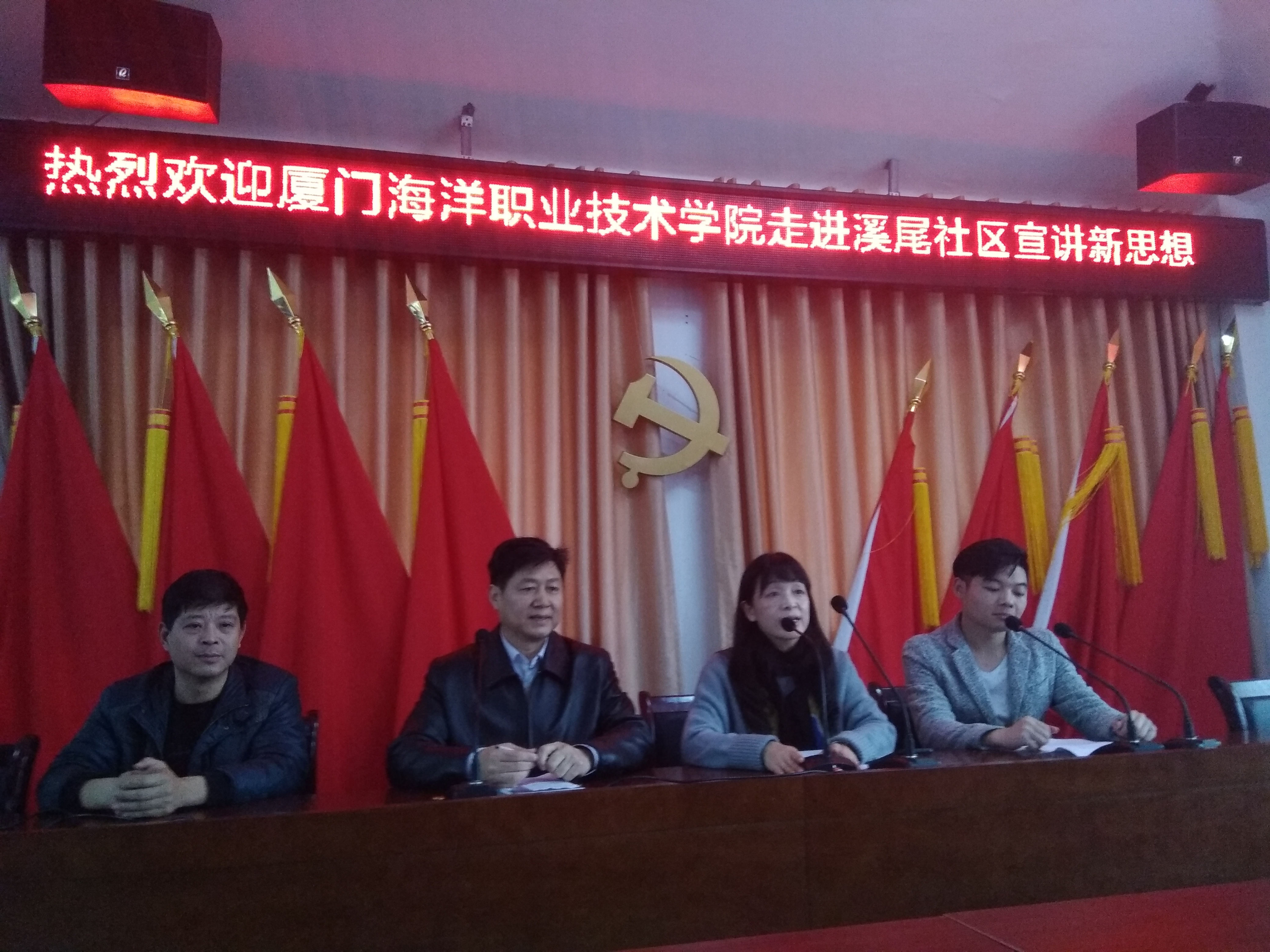 3月6日,学院基础党总支副书记王斌、思政党支部党员教师朱静蓓以及习近平新时代中国特色社会主义思想读书社成员绳冬冬、张金凤,到厦门市翔安区溪尾社区党总支开展习近平新时代中国特色社会主义思想大宣讲活动。