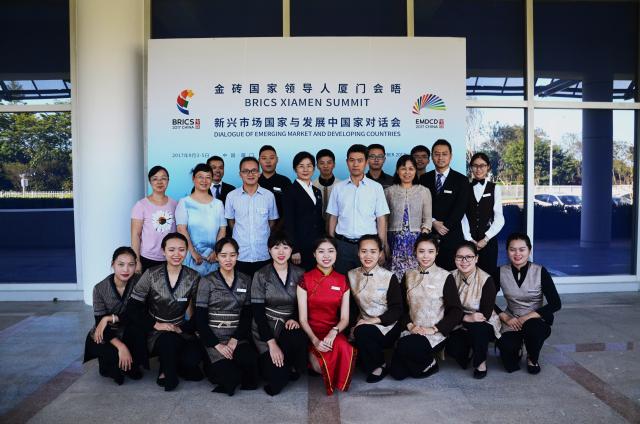 据悉,厦门国际会议中心酒店&国际会展酒店是2017年金砖国家领导人厦门会晤以及新兴国家与发展中国家对话会议活动的核心接待酒店,承接了欢迎晚宴、工商论坛茶歇、多场双边会议和埃及总统一行的接待。我院有旅游管理、商务英语、商务日语和国际金融等专业的26名学生参与金砖峰会工商论坛茶歇服务、国宴服务和中西餐服务。同学们以专业的技能、优雅的气质、温馨的服务,在国宾接待舞台展示了最高标准的服务魅力,得到企业的高度肯定,有14名同学在金砖会晤服务后被企业留用。金砖服务接待任务的圆满完成,是对我院人才培养水平的一次成功检验,更是我院办学实力和社会影响力的重要体现。