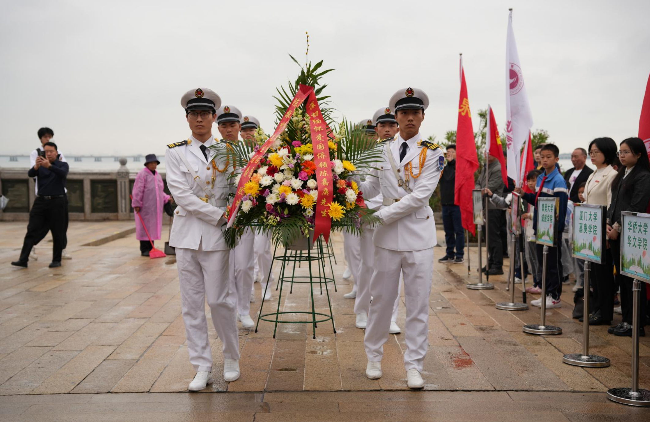 祭扫仪式开始,集美大学轮机工程学院国旗班仪仗队迈着整齐的步伐,怀着崇敬的心情向陈嘉庚先生墓敬献花篮,寄托着厦门市各界人士对陈嘉庚先生的无尽哀思与崇高敬意。紧接着,集美工业职业学院学生献上《嘉庚先生我们来到您身边》,激励着莘莘学子传承嘉庚精神,为国家的发展、民族的振兴贡献力量。