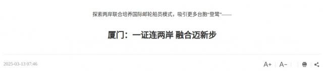 2023年9月,厦门出台《关于支持鼓励台胞来厦参加船员培训和申请证书的若干措施》,为台胞来厦参加船员培训、考取大陆颁发的船员证书,创造了更加便利的条件。截至目前,已有超400名台胞来厦参加培训并考取船员证书,其中青年占比超过80%。