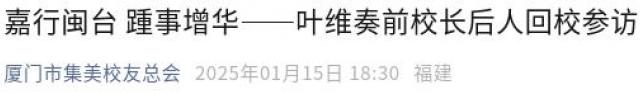 厦门海洋职业技术学院注重赓续历史、立足区位,一直以来促进闽台教育融合发展。“祖国统一是校主陈嘉庚先生的夙愿。今年是抗日战争胜利80周年,我们通过此次活动,共同纪念叶维奏校长,回顾学校在闽台、厦金融合方面的历史渊源,在新时期下,不断深化与台湾的多层次、宽领域教育交流与合作,服务两岸融合发展示范区建设。”陈一端说。
