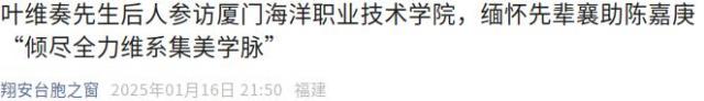 1月13日,厦门海洋职业技术学院迎来了一批特殊的客人。该校前身集美联合职业学校时期的老校长、抗战胜利后金门县首任县长叶维奏先生的儿子、著名书法家叶曼林携全家回校参访。