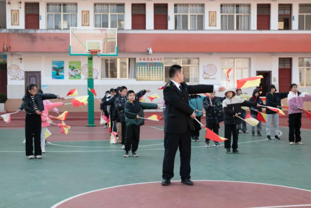 图10:实践队成员教授海岛中心小学学生用旗语打出“我爱你中国”