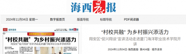 11月1日上午,厦门海洋职业技术学院学术报告中心内气氛热烈,4位宣讲员带着满满的干货走进高校,为在场的200余名师生及社区(村)“两委”成员带来一场别开生面的宣讲。原来,这是翔安区创新“村校共融”宣讲模式首次走进高校开展“促兴翔谈”宣讲活动,现场掌声不断。