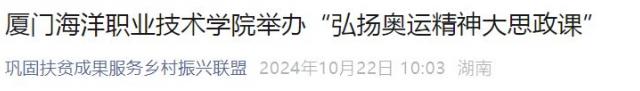 10月16日,一堂特别的“弘扬奥运精神大思政课”在厦门海洋职业技术学院翔安校区举办。本次活动由中共福建省委教育工委、福建省教育厅、福建省体育局主办。