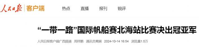 10月12日,2024“一带一路”国际帆船赛(中国北海站)正式收官。来自12个国家和地区的30支高水平帆船队伍经过为期3天紧张激烈的比赛,决出冠亚季军。接下来,“一带一路”国际帆船赛将于11月1日至4日、11月14日至18日、11月27日至12月1日先后在马来西亚兰卡威、克罗地亚里耶卡、土耳其博德鲁姆3个境外站举行。