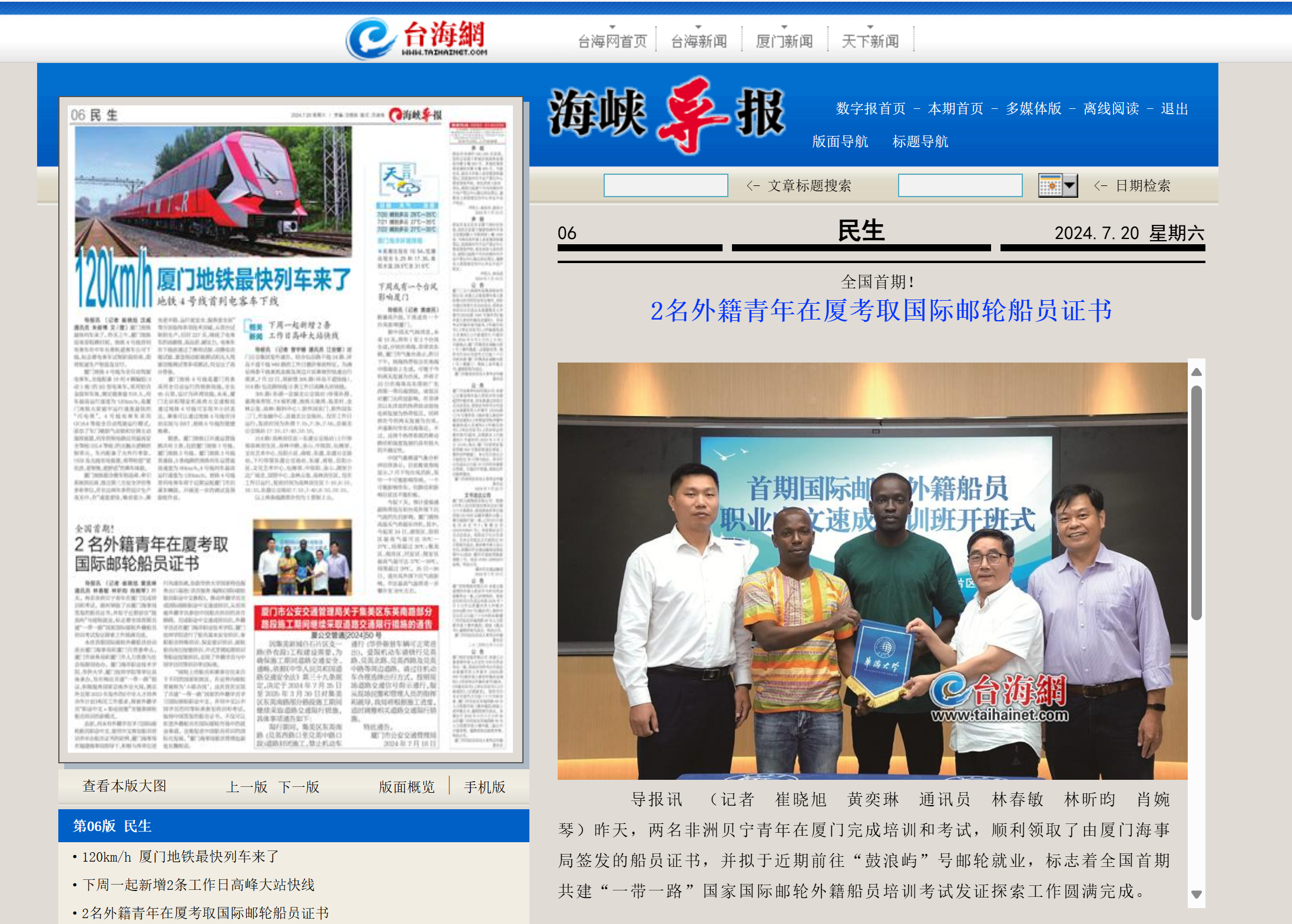 导报讯 (记者 崔晓旭 黄奕琳 通讯员 林春敏 林昕昀 肖婉琴)昨天,两名非洲贝宁青年在厦门完成培训和考试,顺利领取了由厦门海事局签发的船员证书,并拟于近期前往“鼓浪屿”号邮轮就业,标志着全国首期共建“一带一路”国家国际邮轮外籍船员培训考试发证探索工作圆满完成。