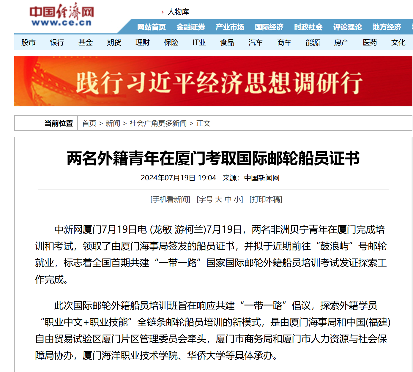 中新网厦门7月19日电 (龙敏 游柯兰)7月19日,两名非洲贝宁青年在厦门完成培训和考试,领取了由厦门海事局签发的船员证书,并拟于近期前往“鼓浪屿”号邮轮就业,标志着全国首期共建“一带一路”国家国际邮轮外籍船员培训考试发证探索工作完成。