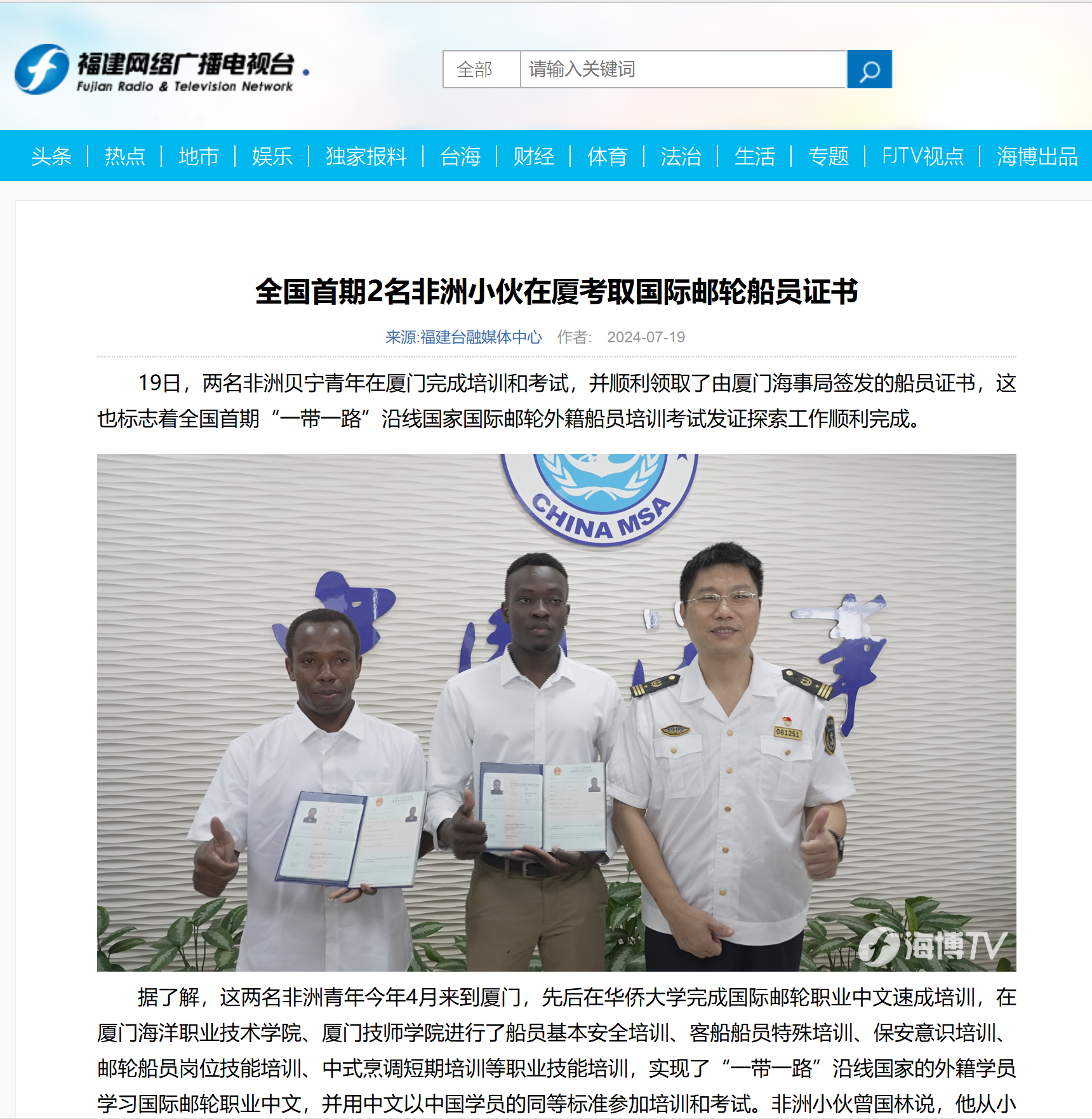 19日,两名非洲贝宁青年在厦门完成培训和考试,并顺利领取了由厦门海事局签发的船员证书,这也标志着全国首期“一带一路”沿线国家国际邮轮外籍船员培训考试发证探索工作顺利完成。