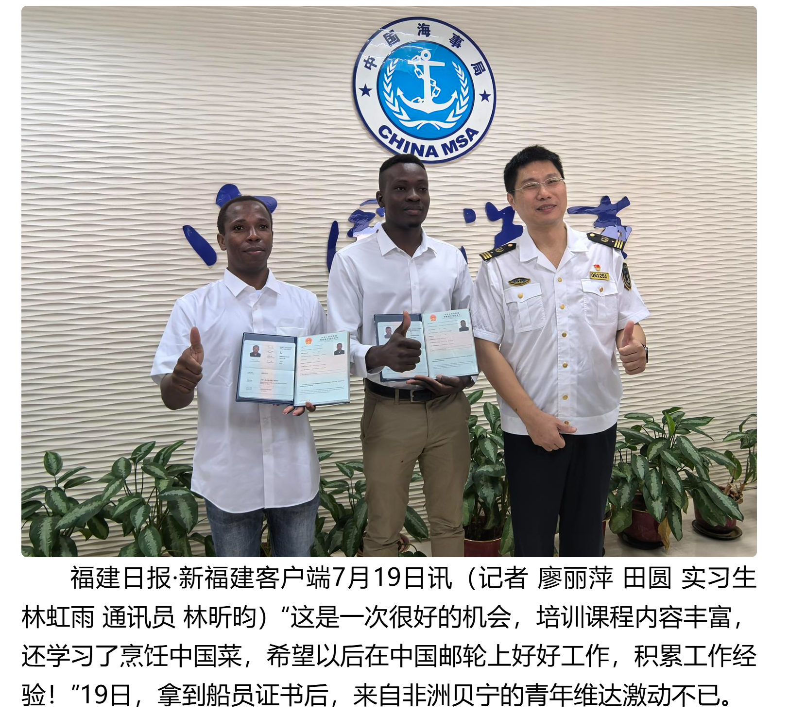 当天,他和另一名来自贝宁的青年曾国林(中文名)一同结束了为期三个月的培训和考试,领取了由厦门海事局签发的船员证书,并拟于近期前往“鼓浪屿”号邮轮就业,成为全国首期“一带一路”共建国家邮轮外籍船员培训班结业学员。