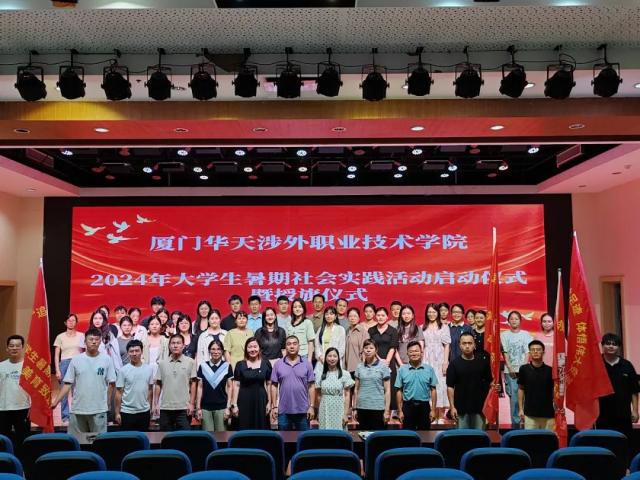 7月12日,厦门华天涉外职业技术学院2024年“追寻领袖足迹 体悟伟大变革”暑期社会实践活动启动仪式暨授旗仪式举行。举办暑期社会实践活动,旨在推动学校“大思政”教育体系构建,引导和帮助广大青年学生在与现实相结合的“大思政课”中“受教育、长才干、作贡献”,争做有理想、敢担当、能吃苦、肯奋斗的新时代好青年。