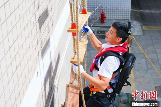 图为选手正在进行攀爬引航梯比赛。刘剑华摄