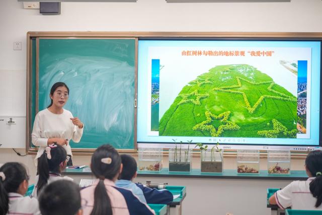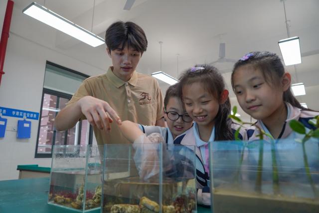 国家级职业教育教师创新团队核心成员、我校教务处副处长许敏博士向同学们讲述了我国红树林概况、红树林的奇异特征、红树林生物多样性及生态保护重要价值,鼓励同学们做海洋生态的保护使者。我校水族协会、海蛏山行项目实践队,带来红树林生态系统展示缸及贝类生物等,与同学们辨识贝类内部结构,手绘红树林生态图,课堂互动气氛活跃。同学们在探索红树林的生存智慧的同时,提升了守护红树林、共建生态美的海洋生态保护意识。