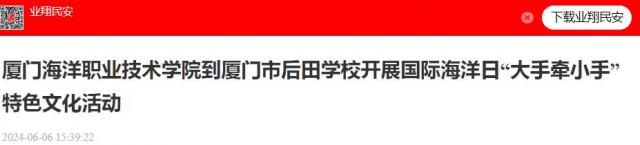 大手牵小手,向海共图强,2023年5月,厦海职院公共教育学院与厦门市后田学校签约合作共建。2023年6月,厦门市后田学校师生应邀到厦海职院开展龙舟文化月主题研学活动。本次厦海职院到厦门市后田学校开展国际海洋日“大手牵小手”特色文化活动,是两校合作共建又一次生动实践,是“大中小一体化”海洋特色文化共教共培的又一成果,对于推动海洋文化教育的发展、提升学生的综合素质及促进地方海洋文化的传承与创新具有重要意义。