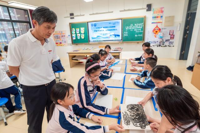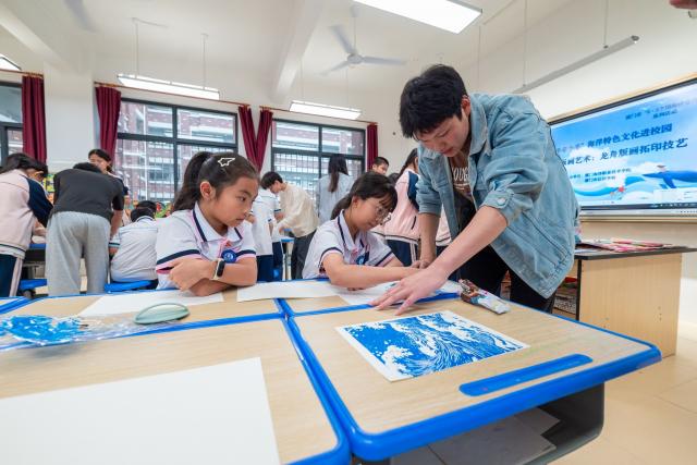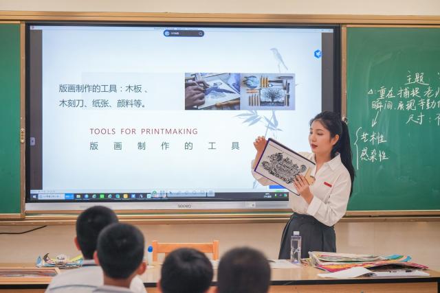 我校美育教师张冰倩指导学生开展非遗木版画艺术——龙舟版画拓印技艺实践。本场美育实践课围绕中国传统节日端午节以及世界海洋日两大主题,对木版画的历史发展、木版画的种类、木版画的雕刻进行讲解,现场开展龙舟版画拓印技艺实践。学生现场体验了完整的木版画拓印过程,利用滚筒、马莲、刮刀等工具拓印自己喜欢的主题木版画。学生在木版画拓印的过程中展示出了对成果的喜悦感、自豪感,充分感受到中国木版画的艺术魅力。