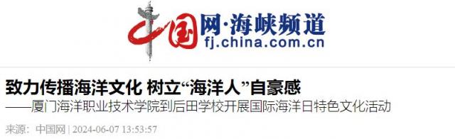 大手牵小手,向海共图强,2023年5月,厦门海洋职业技术学院公共教育学院与厦门市后田学校签约合作共建。2023年6月,厦门市后田学校师生应邀到厦门海洋职业技术学院开展龙舟文化月主题研学活动。本次厦门海洋职业技术学院到厦门市后田学校开展国际海洋日“大手牵小手”特色文化活动,是两校合作共建又一次生动实践,是“大中小一体化”海洋特色文化共教共培的又一成果,对于推动海洋文化教育的发展、提升学生的综合素质及促进地方海洋文化的传承与创新具有重要意义。(王秀华 张娴静)