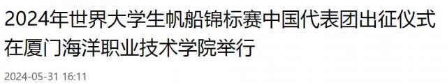 海峡导报新福建客户端5月31日讯(通讯员 葛冯敏 程霞 记者 梁静)2024年世界大学生帆船锦标赛将于6月4日—11日在意大利举办。根据教育部和中国学生体育联合会的安排,厦门海洋职业技术学院和厦门大学将联合组队代表中国队参赛。5月28日,2024年世界大学生帆船锦标赛中国代表团出征仪式在厦门海洋职业技术学院举行。