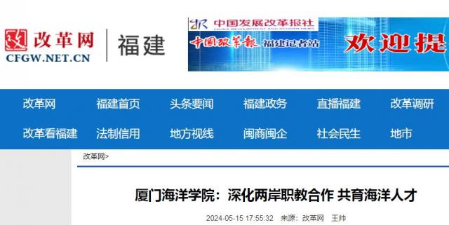改革网讯 近日,厦门海洋职业技术学院以厦台职教高地建设为主体,弘扬嘉庚精神,践行“开拓海洋,力挽海权,培育专才”的创校理念,通过一系列改革创新模式,深入推动闽台职业教育融合发展,探索服务海峡两岸融合发展的新路径。