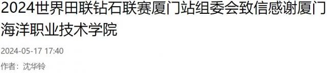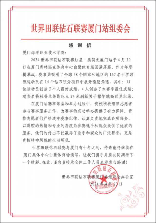 海峡导报新福建客户端5月17日讯(记者 沈华铃 通讯员 程霞)近日,世界田联钻石联赛厦门站组委会办公室向厦门海洋职业技术学院发来感谢信,感谢海洋文化与旅游学院休闲体育专业的志愿者们参与赛事服务工作,以满腔的热情和专业的态度为参赛选手和观众提供了优质的服务,展现出积极向上、刚健有为的精神风貌。