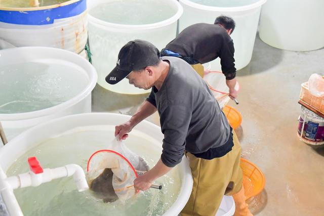 3月18日,福建省蓝粮渔业有限公司工作人员正在清洗海马饵料。(图片来源:中新社)