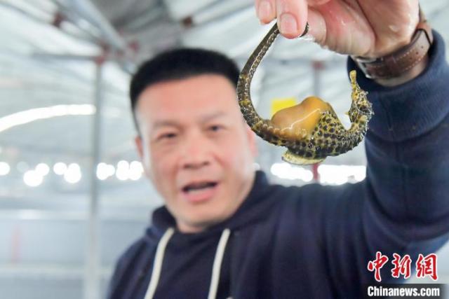 3月18日,福建省蓝粮渔业有限公司执行董事、总经理吴国斌展示成年海马。刘其燚 摄