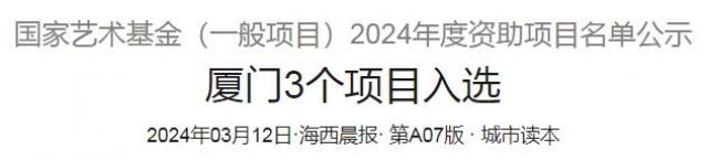 晨报讯(记者 叶子申)近日,国家艺术基金(一般项目)2024年度资助项目名单公示,福建共21个项目入选,其中有3个来自厦门,分别是厦门市南乐团的跨界融合作品《礼乐千秋》、厦门海洋职业技术学院的“以‘船’述史:中国古船模工艺制作人才培训”和集美大学美术与设计学院陈其端的漆画《集美龙舟赛》。