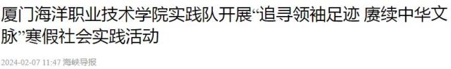 海峡导报新福建客户端2月7日讯(记者 梁静 通讯员 林俊毅 谢玲 何燕真)为学习贯彻习近平文化思想,引导青年学生下基层、走乡村,传承嘉庚精神,近日,厦门海洋职业技术学院信息工程学院组建“嘉庚星”社会实践队赴厦门市集美区开展“追寻领袖足迹,赓续中华文脉”寒假社会实践活动。