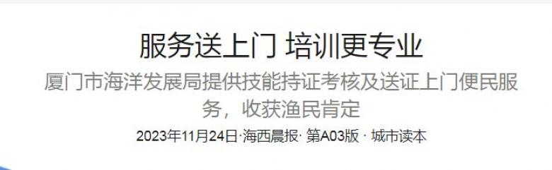 自2015年起,市海洋发展局主动部署,为群众办实事、解难事,积极委托具备专业资质的第三方机构厦门海洋职业技术学院送培训进渔村、入渔港,把课堂、考场搬到渔民家门口,变群众“求服务”为政府“送服务”。