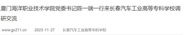 11月21日,厦门海洋职业技术学院党委书记陈一端、校长陈昌萍一行7人来长春汽车工业高等专科学校调研交流。学校党委副书记、校长李春明,副校长胡国良、韩萍陪同调研。