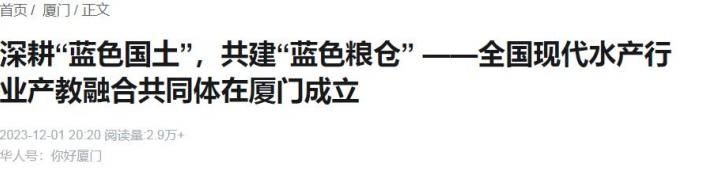 福建省长达3752公里的陆地海岸线、13.6万平方公里的海域面积,彰显着得天独厚的海洋优势。习近平总书记在福建工作期间始终高度重视海洋发展,在宁德要求“耕海牧渔”,念好“山海经”;在福州指出要“像重视耕地一样重视海域,像抓粮食生产一样抓海洋开发,把加快经济发展的触角从陆地向海洋延伸”。进入新时代,福建始终牢记总书记嘱托,科学建设“福海粮仓”,为粮食安全奠定坚实基础。2022年,福建省水产品总产量达到861.4万吨,高居全国第一,远超全国平均水平;水产品出口贸易额达到85亿美元,约占全国水产品出口额的36%,连续十年位居全国第一;渔业经济总产值3625亿元,同样位居全国前列。“福建是全国水产大省,在福建成立全国现代水产行业产教融合共同体,符合全国水产行业的结构布局,契合本地产业结构和经济社会发展需求,对福建加快建设海洋强省建设、引领推动全国水产行业健康长远发展具有积极意义。”全国水产技术推广总站站长助理黄太寿说。而行业产教融合共同体是职业教育改革发展中备受关注的一项创新举措。“近年来,福建省委省政府深入推进福建特色现代职业教育体系建设,多措并举深化产教融合、校企合作。厦门是教育部、福建省共建的全国职业教育创新发展高地,此次牵头成立全国现代水产行业产教融合共同体,是省市建立‘产教布局高度匹配、服务高效对接、支撑全行业发展’产教融合新型组织形态的一次重要尝试。”福建省政协教科卫体委员会副主任刘健说。