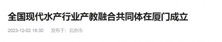 12月1日,全国现代水产行业产教融合共同体(以下简称“共同体”)在厦门成立,旨在发挥各成员单位在现代水产行业中的资源优势和引领作用,搭建政、校、行、企、所多元主体的合作交流平台,加快培育现代水产行业高素质人才,加大产业核心技术增强企业自主创新能力,助力全面推进乡村振兴,提升中国水产技术国际竞争力和影响力,以产教双向赋能推动现代水产行业产业高质量发展。