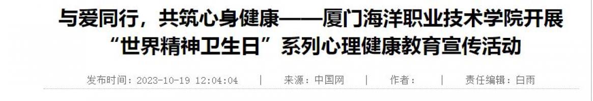 “世界精神卫生日”由世界精神病学协会在1992年发起,旨在积极传播心理健康和精神卫生防治知识,提高公众心理健康素养,时间为每年的10月10日。近年来,厦门海洋职业技术学院心理健康咨询与教育中心不断创新宣传形式,为学校全体师生组织开展丰富多彩的心理健康教育宣传活动,不断提升校园师生心理健康素质,维护校园稳定与安全。(图文来源:谢佳军谢佳新)