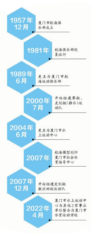 厦门市体育运动学校校长、原厦门市水上运动中心主任徐卫华向本报记者介绍,厦门市水上运动中心的前身是1957年12月成立的厦门市航海俱乐部,其宗旨是为海军培养后备力量。厦门市航海俱乐部被当时的国家体委列为全国10个开展航海运动的重点城市之一。上世纪60年代,厦门市航海俱乐部的训练和比赛均与武装部联合进行,除了俱乐部自有的教练员外,还由海军派教官协助训练,得到了驻厦海军部队的全力支持与帮助,系海军后备人才培养机构。
