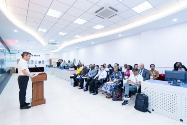 院长陈昌萍教授首先发表致辞,热烈欢迎研修班来校考察。他介绍,学校创办至今已有103年海洋职教办学历史,除做好国内学历教育和培训外,还致力于招收和培养“一带一路”“金砖”国家和地区的留学生,开展海外技术培训和技术服务,推进国际化的教育交流合作平台建设。目前学校已面向十余个国家开展“中文+职业技能”培训,为当地提供智慧渔业应用技术的指导和服务。他指出,学校作为首批“金砖国家新工业能力提升培训基地”,将重点围绕海洋生物、智慧渔业、国际航运等优势领域,积极开发针对“金砖”国家发展需求的职业教育培训课程,积极开展多层次、多领域的人才培养和技术服务工作,为构建海洋命运共同体贡献智慧和力量。