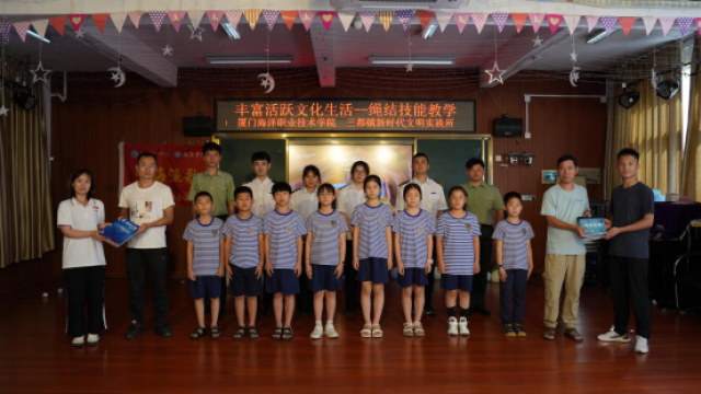 实践队成员以“理论讲解+现场演示+互动比赛”的形式,科普海洋知识,与孩子们一同探寻蔚蓝海洋。值得一提的是,实践队还带来了航海学院特色的海丝结工艺,在现场教授不同绳结的使用方法。同时,团队中的退伍军人在现场向孩子们分享军营故事,并一同进行模拟军训,让孩子们感受军人风采,种下海洋强国的梦想种子。活动最后,实践队成员送上航海文创小礼品与海洋类书籍,帮助孩子们养成爱读书、读好书的好习惯。