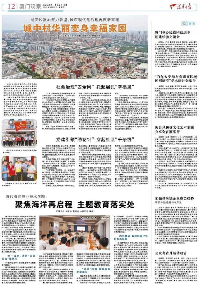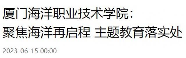 厦门海洋职业技术学院营造知海、亲海、爱海的学习氛围,提前部署,开展海洋日主题党团日活动、向海图强爱国主义思政大课,举办海洋文化、海洋科学高端学术会议,组织党员赴鼓浪屿历史文化陈列馆、厦门特区纪念馆、大嶝岛等地开展海洋研学,同时用好用足校本特色文化资源,推进主题教育提质增效。